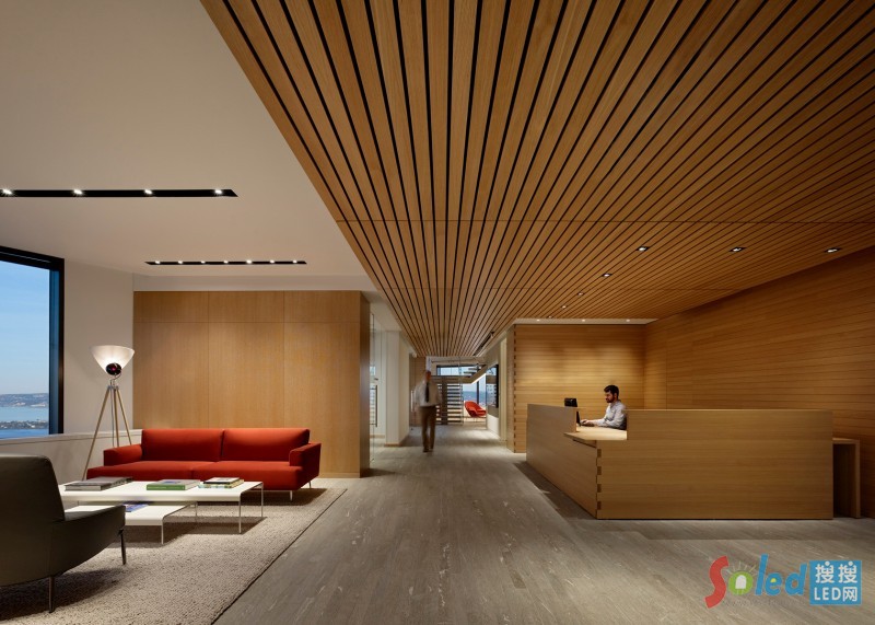 此幢位于舊金山的經(jīng)過改擴建的52層地標(biāo)性摩天大廈是一家著名全球投資公司的總部。照明設(shè)計尊重了建筑本身的幾何結(jié)構(gòu),同時加強了簡約的設(shè)計感。GE 7W LED MR16卡槽燈為其大堂和招待區(qū)提供了常規(guī)照明。線性LED軟燈帶圍繞在大廳和用餐區(qū)木質(zhì)天花板的四周,既產(chǎn)生光暈效果帶來美感,又加強了這些場所特質(zhì)。在會議室和辦公室,集成于隔音天花板內(nèi)的熒光可調(diào)節(jié)GE T5 Watt-Miser®燈保持著室內(nèi)必要的光線水平。同時,7W 嵌入式LED MR16燈為所有場所提供了局部的次要照明。而在充滿挑戰(zhàn)的兩層高交易大廳內(nèi),窄射束卡槽LED燈在提供常規(guī)照明的同時還能控制交易大廳內(nèi)50寸純平顯示器所產(chǎn)生的眩光。