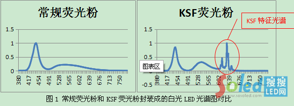我們先來說說什么是KSF。KSF是化學(xué)式K2SiF6:Mn4+的縮寫,中文可以稱為(含四價錳離子的)氟硅酸鉀,封裝行業(yè)上也經(jīng)常把它稱之為氟化物熒光粉。嚴(yán)格意義上來說,KSF是指包含A2(MF6):Mn4+結(jié)構(gòu)式配方的一個類型的化合物,其中A是Li, Na, K, Rb, Cs, NH4的一種,而M是的Ge, Si, Sn, Ti, Zr元素的一種,或者是元素組合。KSF熒光粉是一種紅色熒光粉,它的主要特征是發(fā)射光譜的半波寬非常窄,而且能量很高。圖1是常規(guī)熒光粉LED封裝光譜和KSF熒光粉LED封裝光譜的對比圖。
