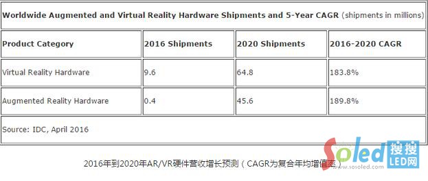美國(guó)市場(chǎng)研究公司IDC發(fā)布的最新報(bào)告顯示,全球增強(qiáng)現(xiàn)實(shí)(AR)和虛擬現(xiàn)實(shí)(VR)行業(yè)收入將從2016年的52億美元,增長(zhǎng)到2020年的1620億美元。