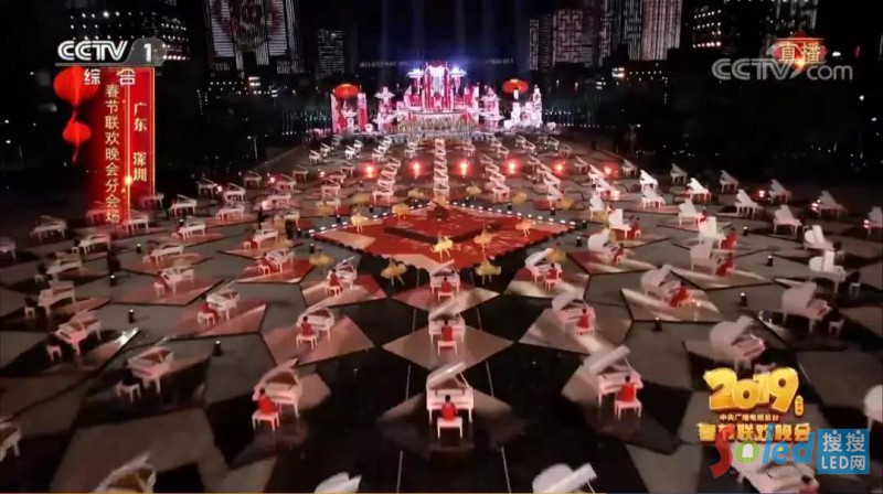 本屆春晚深圳分會場廣場放置了將近150臺白色鋼琴,每一架鋼琴下是由64塊黑色玻璃LED屏幕組成的平臺,由晶臺LED器件、光祥制造的LED屏幕在晚會上光芒四射,大放異彩,光影和音樂的組合為觀眾帶來不同凡響的視聽盛宴,為全球觀眾呈現(xiàn)了完美的舞臺視覺效果。呼應(yīng)晚會“奮進新時代、歡度幸福年”主題,充滿現(xiàn)代科技感的營造出歡樂祥和、喜氣洋洋的新春氛圍,為全球華人獻上一道豐盛的年夜大餐。