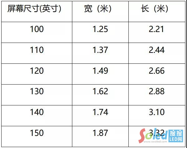 液晶顯示技術(shù),100英寸以上電視的另外一個問題是運輸、入戶困難。下表是100英寸到150英寸電視的長寬尺寸。