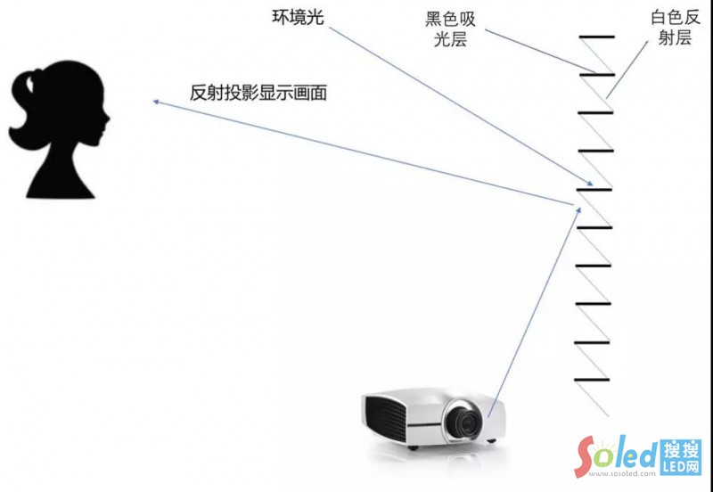 激光投影抗光幕示意圖如圖所示,抗光幕微結(jié)構(gòu)為鋸齒狀的光學(xué)結(jié)構(gòu),鋸齒結(jié)構(gòu)上方為涂覆黑色材料的吸光層,下方為涂覆特殊材料的白色反光層。黑色層可以吸收環(huán)境光,提高對比度,白色反光層用于投影時反射圖像。從抗光幕的微結(jié)構(gòu)可以發(fā)現(xiàn),幕布無法實現(xiàn)全部黑色,還有相當(dāng)一部分白色,導(dǎo)致幕布的對比度不高,無法實現(xiàn)高品質(zhì)的畫面顯示。