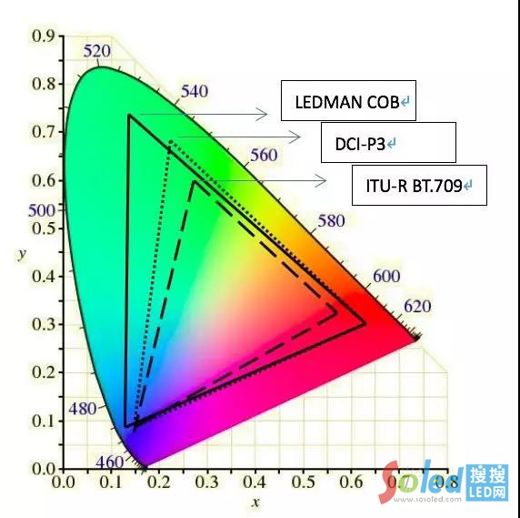 從圖中可以看到,COB 微顯示技術(shù)的色域范圍,與當(dāng)前影視業(yè)采用的DCI-P3標(biāo)準(zhǔn)、ITU-R BT.709標(biāo)準(zhǔn)相比,COB LED微顯示技術(shù)的色域范圍要寬廣得多,與液晶顯示與激光投影相比,對色彩的表現(xiàn)能力更強。