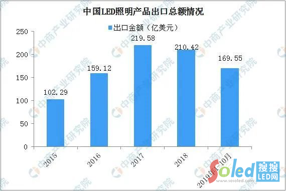 根據(jù)GGII的統(tǒng)計(jì),中國LED照明產(chǎn)品出口總額從2015年的102.29億美元增長到2018年的210.42億美元,年均復(fù)合增長率達(dá)到27.18%。受中美貿(mào)易摩擦的影響,中國LED照明產(chǎn)品出口市場有所下滑,但隨著中美貿(mào)易關(guān)系出現(xiàn)緩和,LED照明出口需求總體呈復(fù)蘇趨勢。