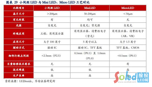 從產(chǎn)品定義上看,按照相鄰像素點間距大小劃分,Mini LED 顯示的定義為像素點間距在 P0.3-P1.0 之間的全彩 LED 顯示屏,而目前市場上量產(chǎn)的多為 P0.9 產(chǎn)品;P0.3以下則為 Micro LED 的概念,受制于巨量轉(zhuǎn)移等技術限制,Micro LED 目前尚處于技術攻關階段。