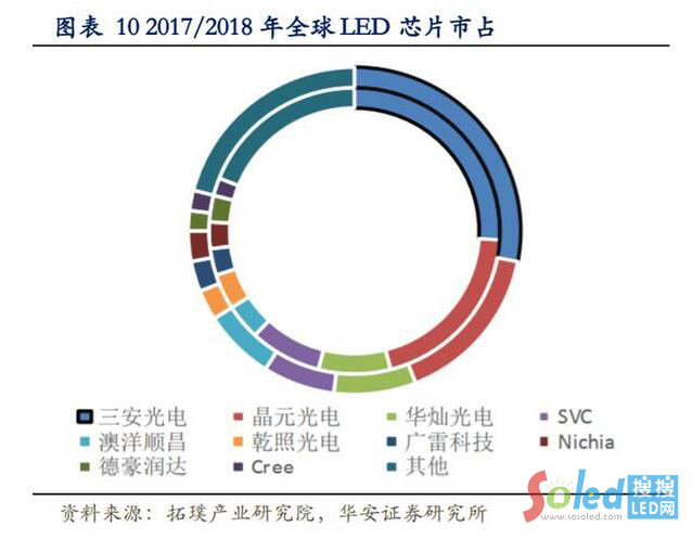 LED 芯片產(chǎn)能過剩,市場價格競爭激烈,不少芯片廠商營收和凈利潤雙雙下降,如德豪潤達這類中小廠商被迫退出芯片市場。2018 年,我國前三家 LED 芯片廠商市占率合計 71%,其中三安光電達到 31%,而其在 2018 年全球 LED 芯片市場中市占率達到 28%。芯片行業(yè)整體競爭格局已初步成型,寡頭效應愈發(fā)明顯,未來行業(yè)集中度料將繼續(xù)提升。