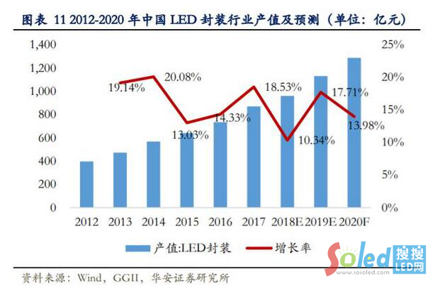高工產(chǎn)研 LED 研究院(GGII)統(tǒng)計數(shù)據(jù)顯示,2019 年中國 LED 封裝產(chǎn)值達到1130 億元,同比增長 17.71%,2020 年產(chǎn)值預計將達 1288 億元,但增速放緩至 13.98%。