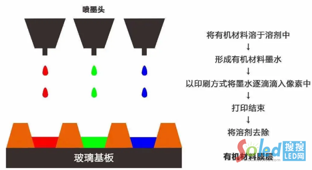 印刷OLED,也稱為噴墨打。↖nkjetPrinting,簡稱IJP),類似于在紙張上噴墨印刷文字,將有機發(fā)光材料噴涂在基板上、經(jīng)過干燥等環(huán)節(jié)后形成發(fā)光薄膜。