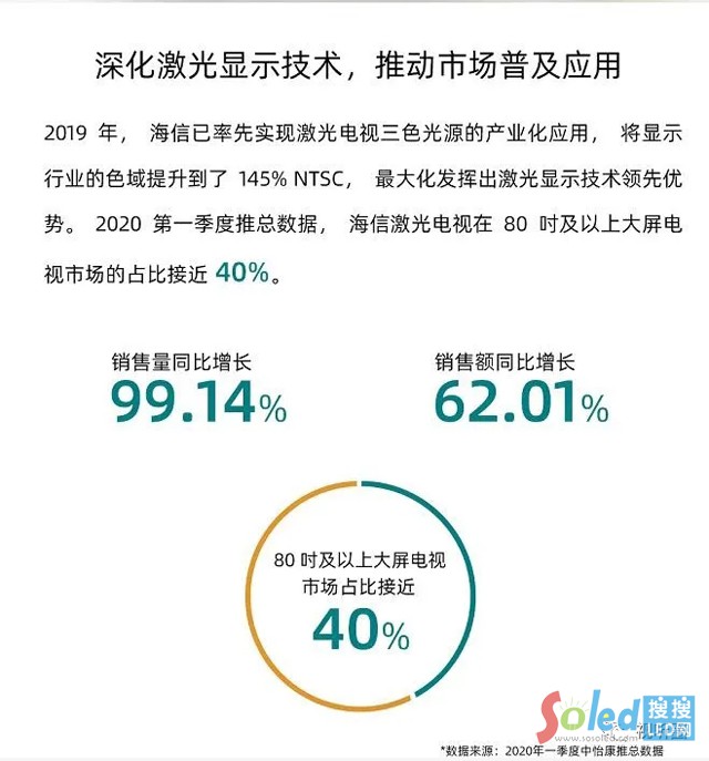 中怡康今年第1季度推總數(shù)據(jù)還顯示,海信激光電視銷售量同比增長(zhǎng)99.14%,銷售額同比增長(zhǎng)62.01%,在80吋及以上大屏電視市場(chǎng)的占比接近40%,繼續(xù)保持著高速增長(zhǎng)的勢(shì)頭。