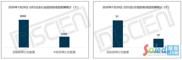 據(jù)DISCIEN數(shù)據(jù)統(tǒng)計(jì)顯示:招投標(biāo)項(xiàng)目自1月29日開始通知延期,截止2月5日,招標(biāo)延期公告數(shù)量高達(dá)9060個(gè),中標(biāo)延期公告延期數(shù)量達(dá)3550個(gè),基本所有項(xiàng)目的招投標(biāo)被按下了「暫停鍵」。