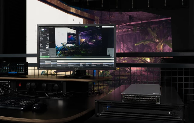 將物理舞臺(tái)與虛擬場(chǎng)景連接起來的基礎(chǔ)設(shè)施。高度集成LED顯示屏硬件、控制系統(tǒng)、內(nèi)容渲染引擎和攝像頭跟蹤。XR虛擬制作服務(wù)器是虛擬拍攝工作流的核心,負(fù)責(zé)接入攝像機(jī)跟蹤系統(tǒng)+虛擬生產(chǎn)內(nèi)容+攝像機(jī)拍攝的實(shí)時(shí)畫面,輸出虛擬內(nèi)容到LED墻,輸出合成的XR視頻畫面給導(dǎo)播臺(tái),用于直播及存儲(chǔ)。最常見的虛擬制作系統(tǒng)有:Disguise、Hecoos。