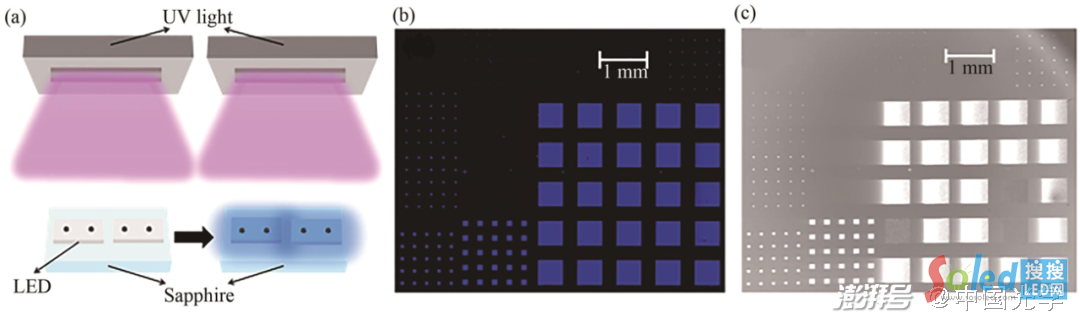 光致發(fā)光(PL)檢測(cè)是無(wú)接觸檢測(cè)中一種常用的檢測(cè)方式。其原理如圖5(a)所示,即使用短波長(zhǎng)光(如紫外光)激發(fā)LED的發(fā)光層的電子使其輻射躍遷。進(jìn)而產(chǎn)生發(fā)光圖像并從發(fā)光圖像中篩選出損壞的LED芯片。使用PL圖像和陰極熒光(CL)成像來(lái)代替電致發(fā)光檢測(cè),同樣實(shí)現(xiàn)無(wú)損檢測(cè)的想法,PL圖像與CL圖像分別如圖5(b)、圖5(c)所示。對(duì)于同一個(gè)多像素LED樣本,使用短波長(zhǎng)的光激發(fā)時(shí),所有像素都會(huì)發(fā)光,但在使用CL成像時(shí)并非所有像素都被點(diǎn)亮。對(duì)此的解釋是,PL的整個(gè)過(guò)程并沒有發(fā)生載流子運(yùn)輸,因而不受LED像素在刻蝕過(guò)后產(chǎn)生的各種短路缺陷的影響。實(shí)驗(yàn)發(fā)現(xiàn)71.75%的像素在CL圖像與EL圖像中都會(huì)發(fā)光,說(shuō)明CL圖像能一定程度上與EL檢測(cè)結(jié)果擬合,但擬合度還需進(jìn)一步提高。