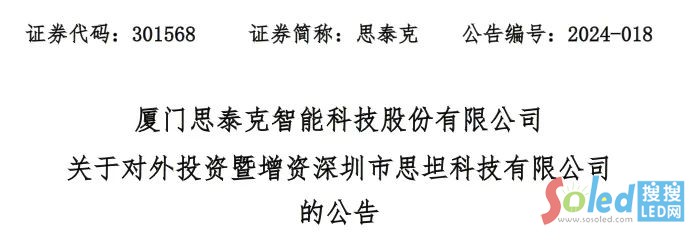4月8日,思泰克發(fā)布對外投資公告,宣布公司擬向深圳市思坦科技有限公司(以下簡稱“思坦科技”)投資3600萬元,參與認購思坦科技新增注冊資本52.66萬元,占本次增資后思坦科技股權比例的1.94%。