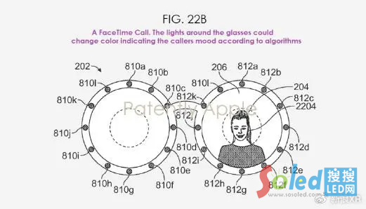 在蘋(píng)果專利圖 22B 中,可以看到一個(gè) FaceTime 通話,LED 顯示屏可發(fā)出不同燈光以此指示對(duì)方的情緒狀態(tài)(高興、悲傷、沮喪)。