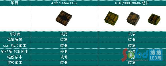 4合1 Mini COB &傳統(tǒng)SMD組件(1010/0808/0606)比較表